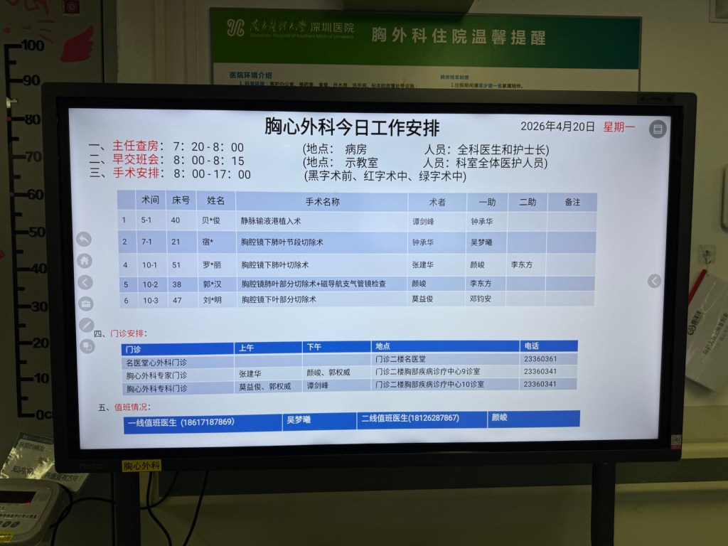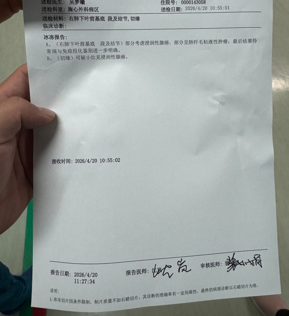 3.八点半开始显示手术,十点多切了病灶送检,很吓人,血淋淋,巴掌大的组织,正常半个钟出结果,直到中午十二点三才告知病灶范围大,要切除左肺全部下叶,容不得思考,当然切,三点半都还在术中。。也就是说等了一个多钟病理分析和做决定
