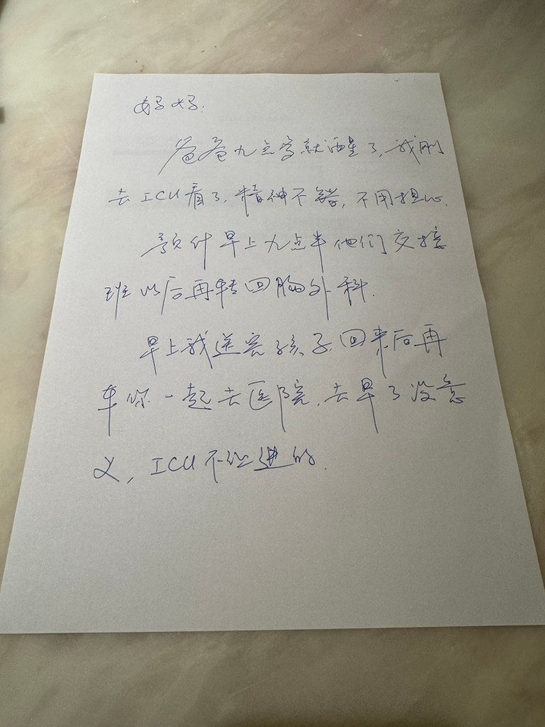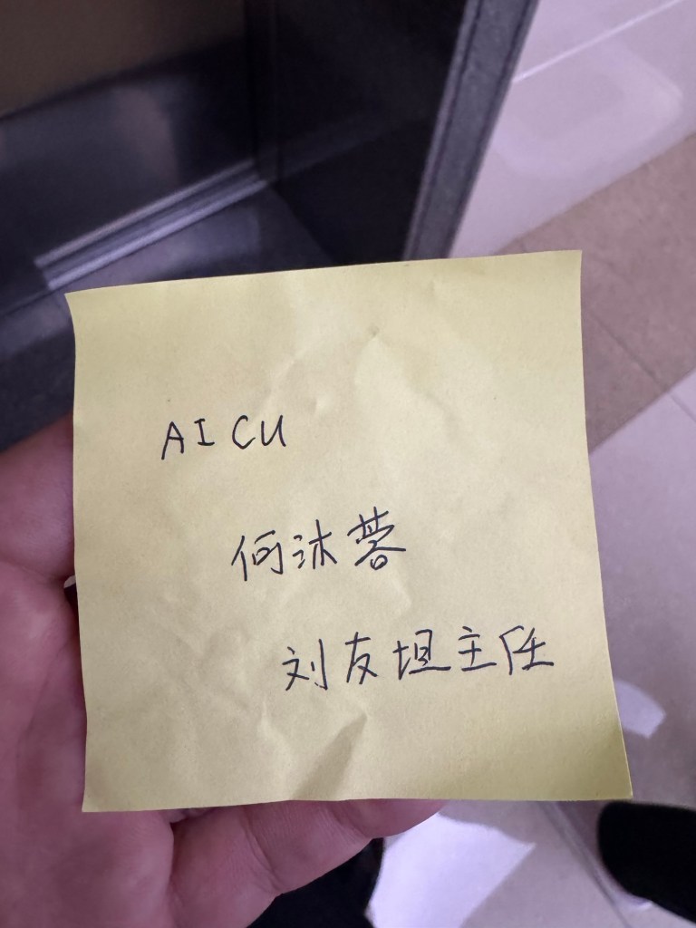 7.说不紧张是假话,我也没遇到过这些事啊,晚饭后抓紧眯了一个多钟,处理完工作事情,打给 AICU,告知已苏醒,赶去探望,只允许一人进去,状态还不错,已拔管,一笑就疼,早上九点多会转回胸外科